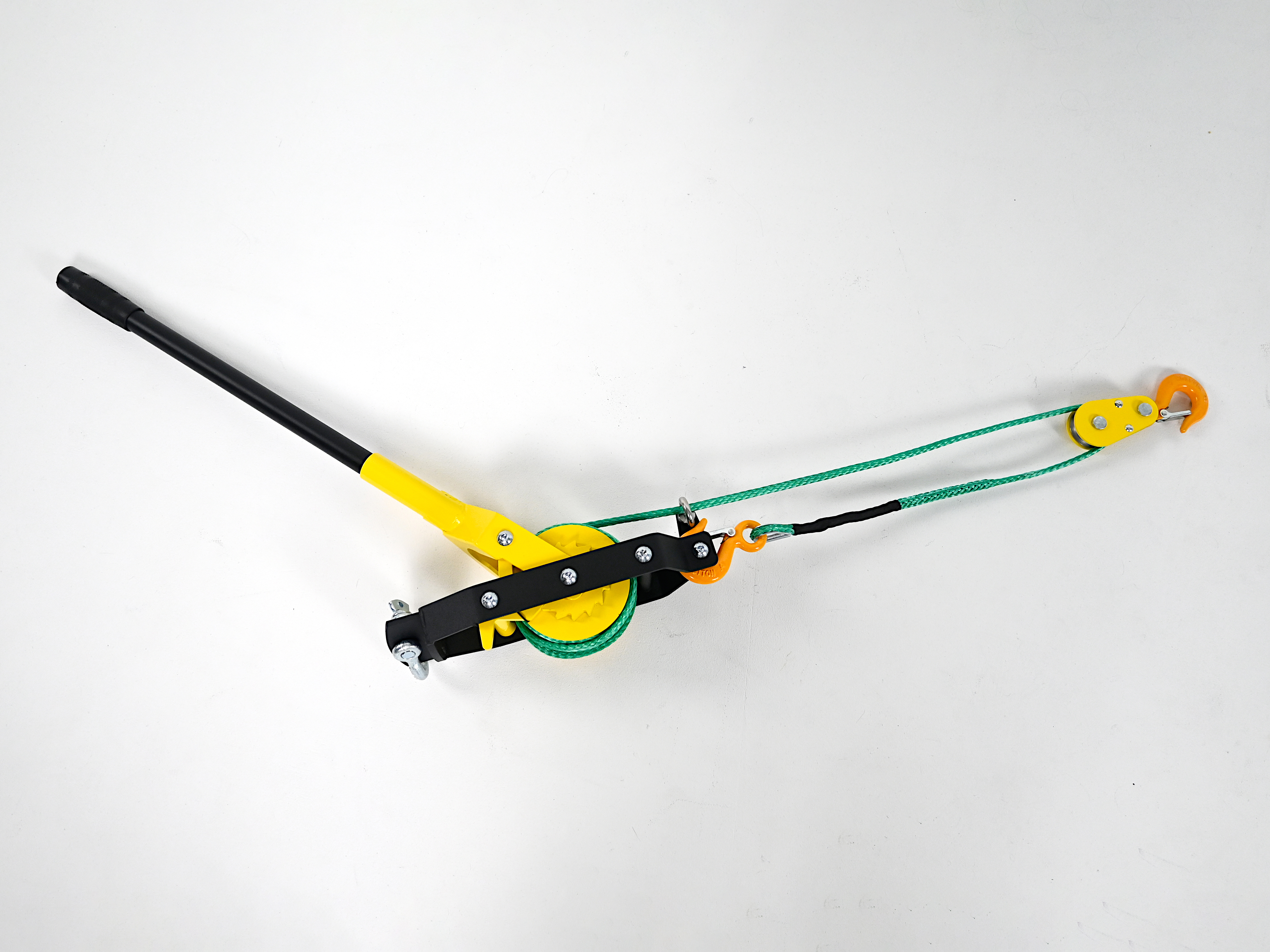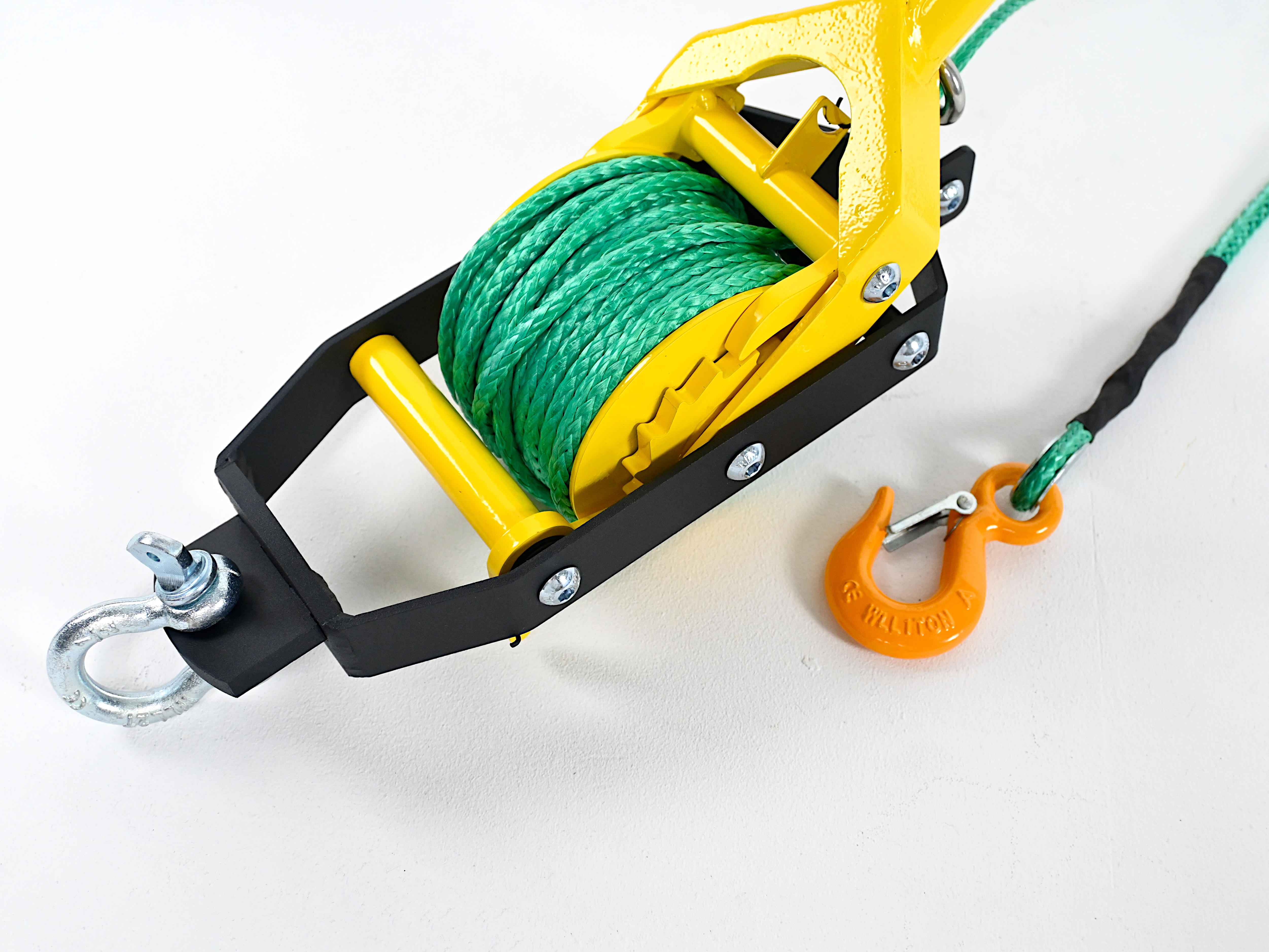 Складной рычаг длиной до 750 мм обеспечивает необходимое передаточное отношение при компактном хранении. Рама из стали толщиной 4 мм, усиленный барабан и порошковое покрытие рассчитаны на длительную эксплуатацию под нагрузкой до 3 тонн (при использовании блока, который входит в комплект).