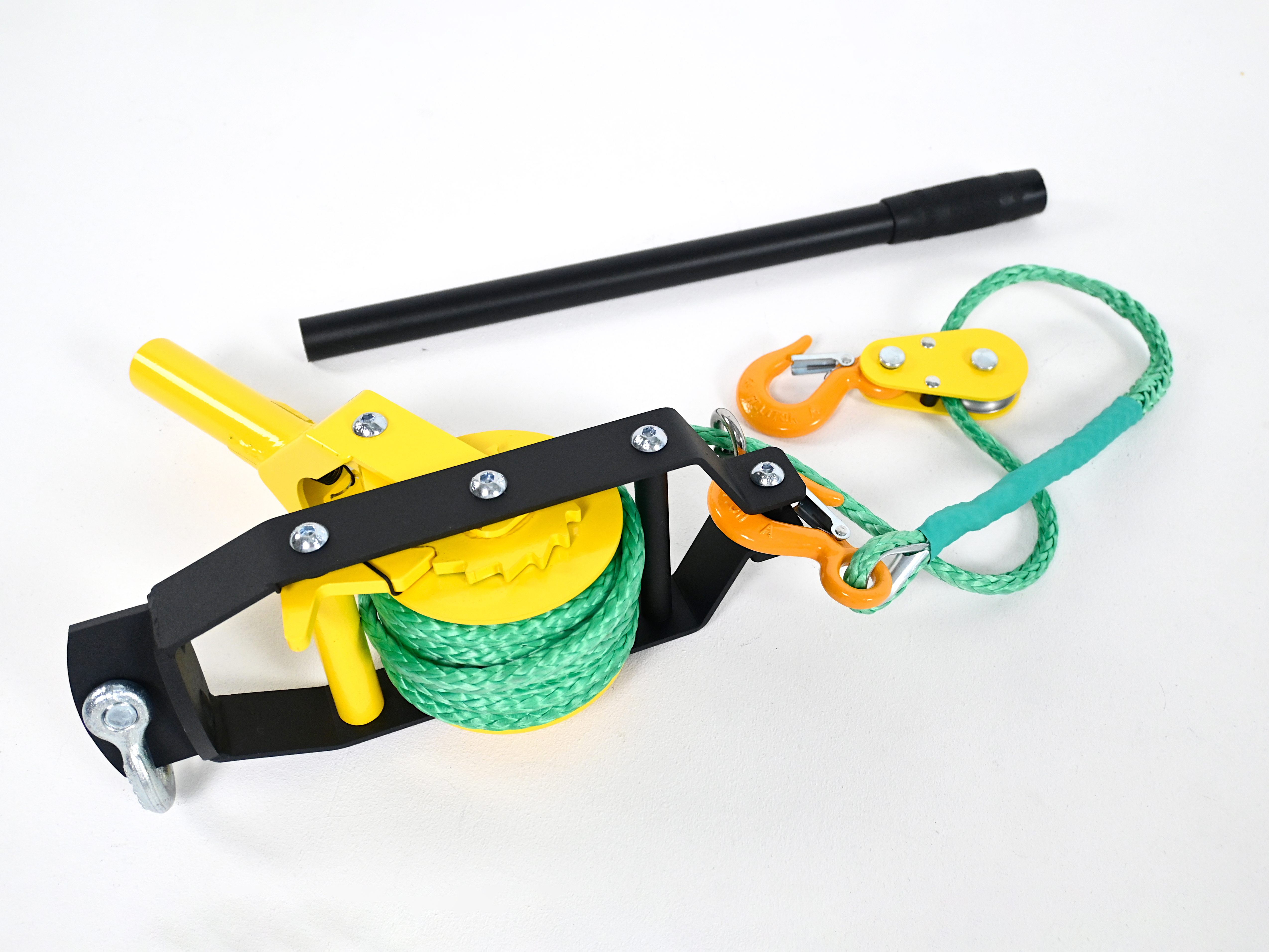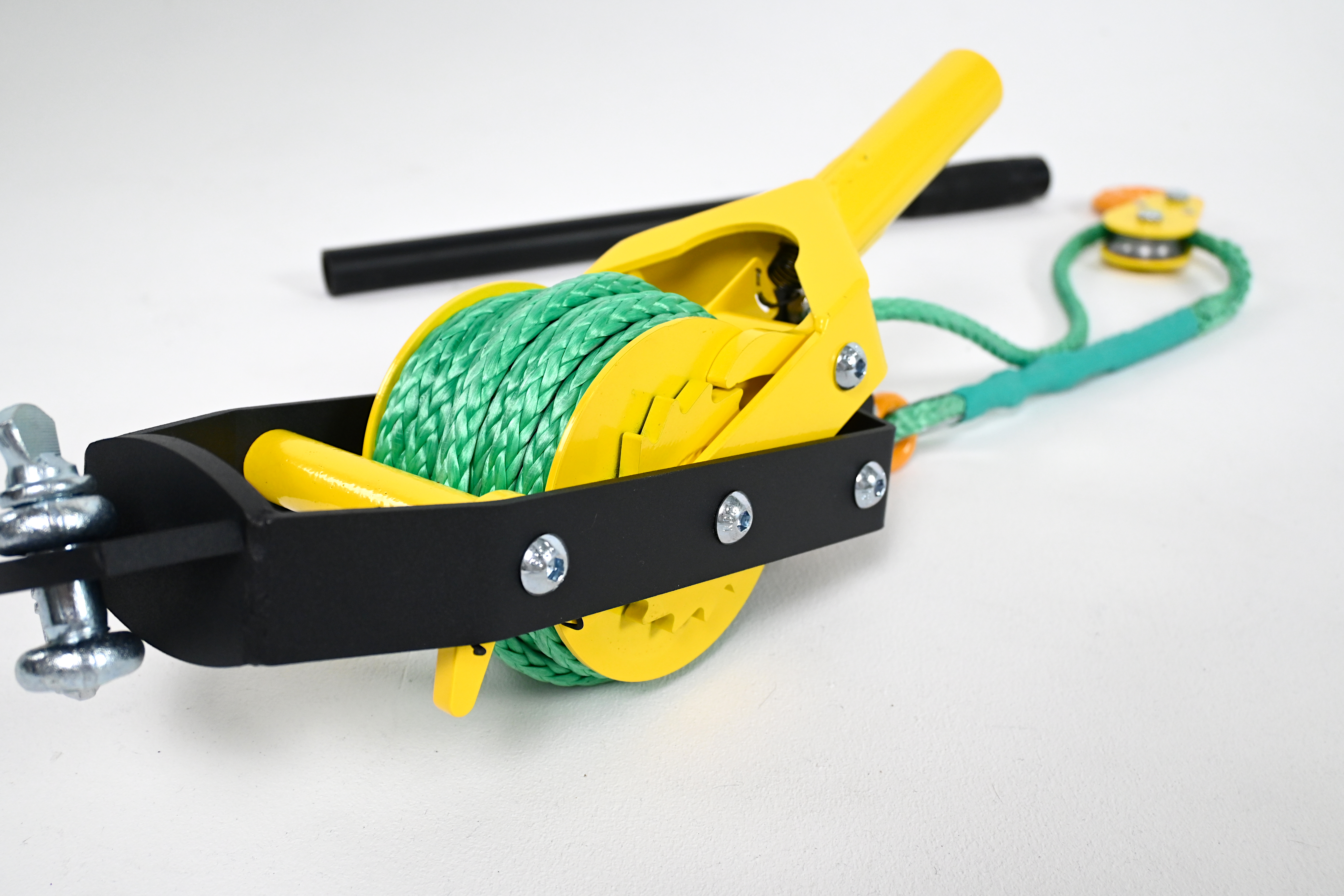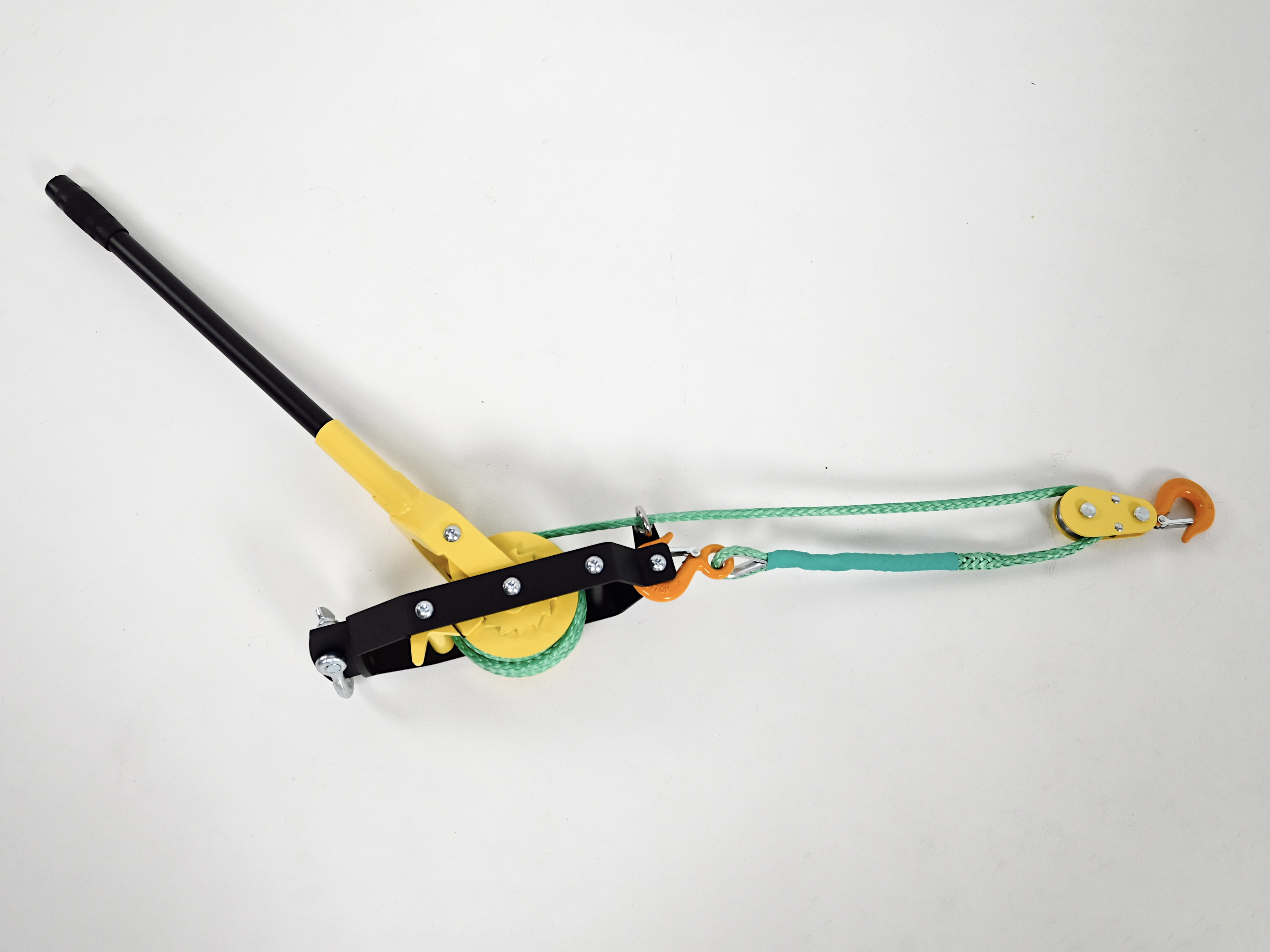 Модель оснащена кевларовым тросом толщиной 8 мм и длиной 9,5 м. В отличие от стали, кевлар не подвержен коррозии, сохраняет гибкость при низких температурах и не повреждает поверхности грузов. Складной рычаг длиной до 750 мм обеспечивает достаточное передаточное усилие при компактном хранении. Рама из стали толщиной 4 мм и усиленный барабан рассчитаны на длительную эксплуатацию под нагрузкой до 4 тонн (при использовании блока, который входит в комплект).